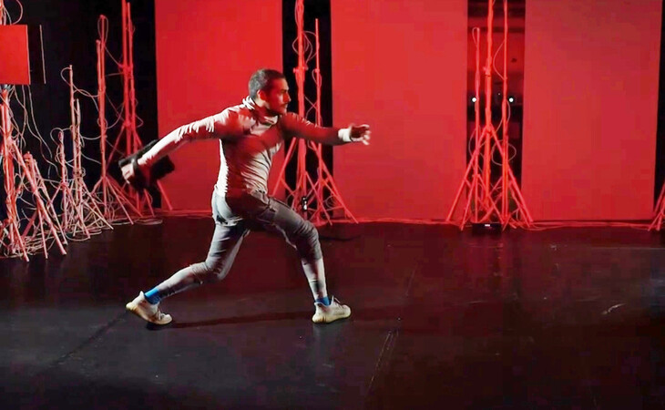 Teilnehmende des Theaterateliers mit Stefano D'Alessio lernen, wie sie ihren Körper interaktiv mit Bild und Ton verbinden können. Anstatt Knöpfe und Regler zu bedienen und auf Bildschirme zu starren, performen sie mit Audio und Bild durch dynamische Körperbewegungen. Mit Hilfe einer speziellen Software und durch Kameras und Mikrophone werden Stimmen und Bewegungen interpretiert.